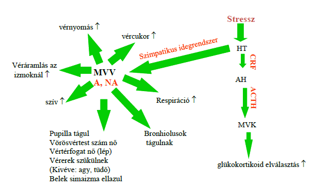- a májban fokozódik a glikogenolízis és a glukoneogenzis, a hasnyálmirigyben gátolt az inzulinfelszabadulás, a zsírszövetben fokozódik a lipolízist, így növekszik a glükóz-, szabad zsírsav- és glicerinfelszabadulása;