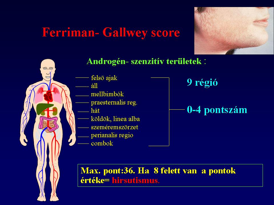A hirsutismus fokát Ferriman és Gallwey szerint határozhatjuk meg, amely a legelterjedtebb szemikvantitatív módszer. Az eljárás 11 régiót vesz figyelembe a női szőrzet megítélésénél, amelyek közül csak 9 számít a hirsutismus pontozásánál, ugyanis az alkar és a lábszár pontjait a hirsutismus súlyosságának megítélésében nem tartja mérvadónak, mivel nem hormon érzékeny testtájék. Minden régióban 0-4-ig lehet pontozni, maximum pontszám: 36. Nyolc pont alatt nincs hirsutismus.