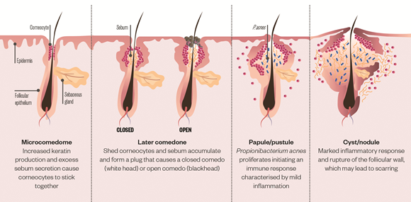 - Az arcon lévő Propionibacterium acnes nevű baktérium elszaporodása, mely a szabad zsírsavak felszabadulása miatt bőr gyulladását okozzák. Az elhalt hámsejtektől és faggyútól elzárt pórusok ugyanis ideális feltételeket biztosítanak a baktériumok megtelepedéséhez.