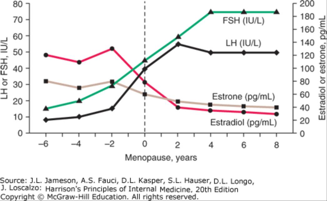 A follicularis ösztrogén szintje hullámzik, az FSH gyorsabban, az LH lassabban, de folyamatosan emelkedik. A ciklus első napjaiban mérve az FSH>15NE/l és az LH>9 NE/l a perimenopausa kezdetét jelzi, míg az FSH>35 NE/l az LH>20 NE/l értékei határozottan a petefészkek működésének csökkenésére utalnak. A szérum-tesztoszteron szintek lassú csökkenése már jóval a menopausa előtt megfigyelhető.