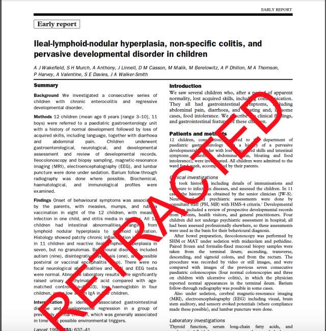 A kutatás eredményeit részletező tanulmány a jó nevű Lancet orvosi folyóiratban jelent meg, ANNAK ELLENÉRE, HOGY MÉG LAIKUSOK SZÁMÁRA IS NYILVÁNVALÓ HIÁNYOSSÁGAI ÉS HIBÁI VOLTAK. A VIZSGÁLATOT MINDÖSSZE 12 GYEREKEN VÉGEZTÉK, AMI NAGYON KICSI MINTA; DE MÉG ENNÉL IS SÚLYOSABB, HOGY KONTROLLCSOPORT EGYSZERŰEN NEM VOLT. Wakefield úgy jelentette ki, hogy az oltás, a Crohn és az autizmus között összefüggés van, hogy meg sem próbálta oltatlan gyerekekkel bizonyítani, hogy náluk ritkább lenne az autizmus és a Crohn.